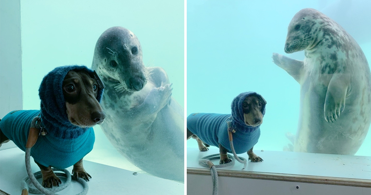 認錯了啦!呆萌海豹見「戴帽子臘腸犬」以為是同類 隔玻璃搭訕:你怎麼不用在水裡?