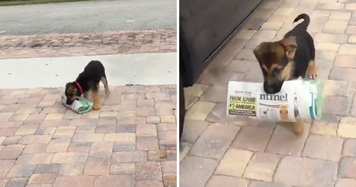 從小就收買人心! 奶汪咬起等身大報紙 晃耳朵衝回家:把拔快誇我~