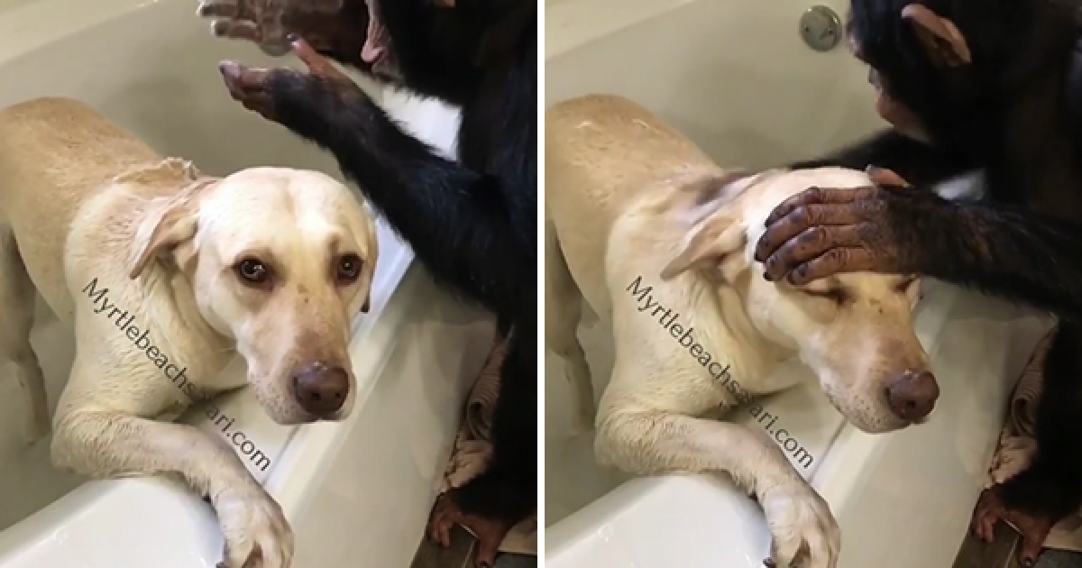「這新來的美容師很可以啊~」 黑猩猩幫白汪洗香香 沙龍級手法讓牠好陶醉