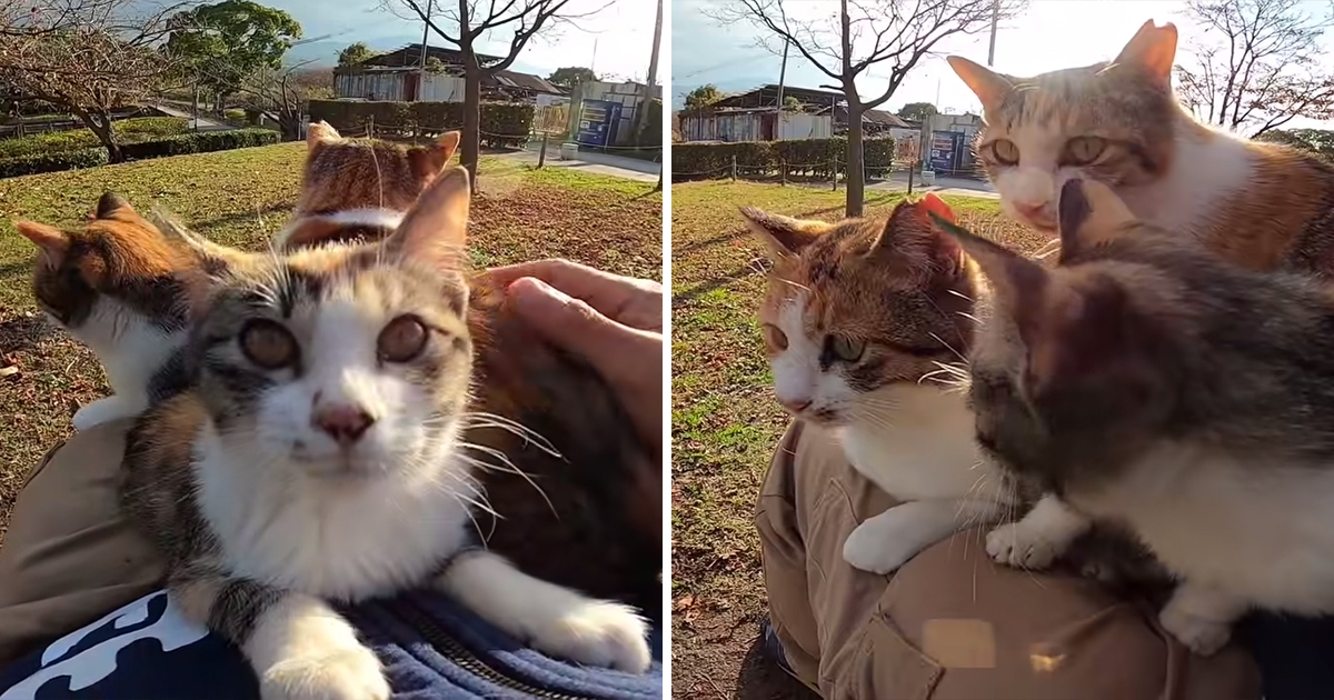 他在公園休息「浪喵跳上雙腿」撒嬌討摸 幾分鐘後「整群跑來爭寵」:我也要躺~