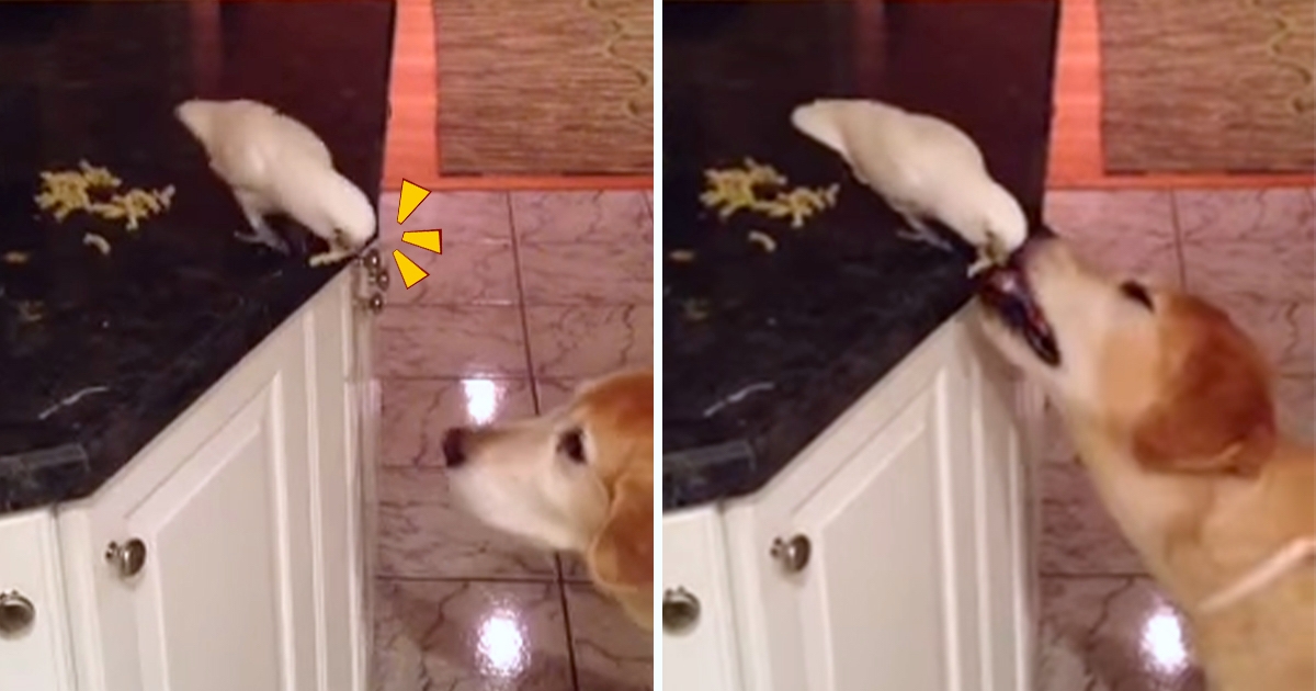 汪汪我大哥!鸚鵡「回報」疼牠的狗狗 偷叼桌麵食物餵食:還不忘沾醬~