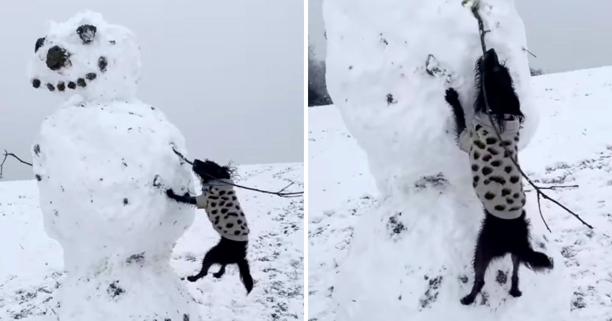 這是玩撿樹枝!阿汪遇到雪人「拒絕離開」 努力拔河:這根是我滴~
