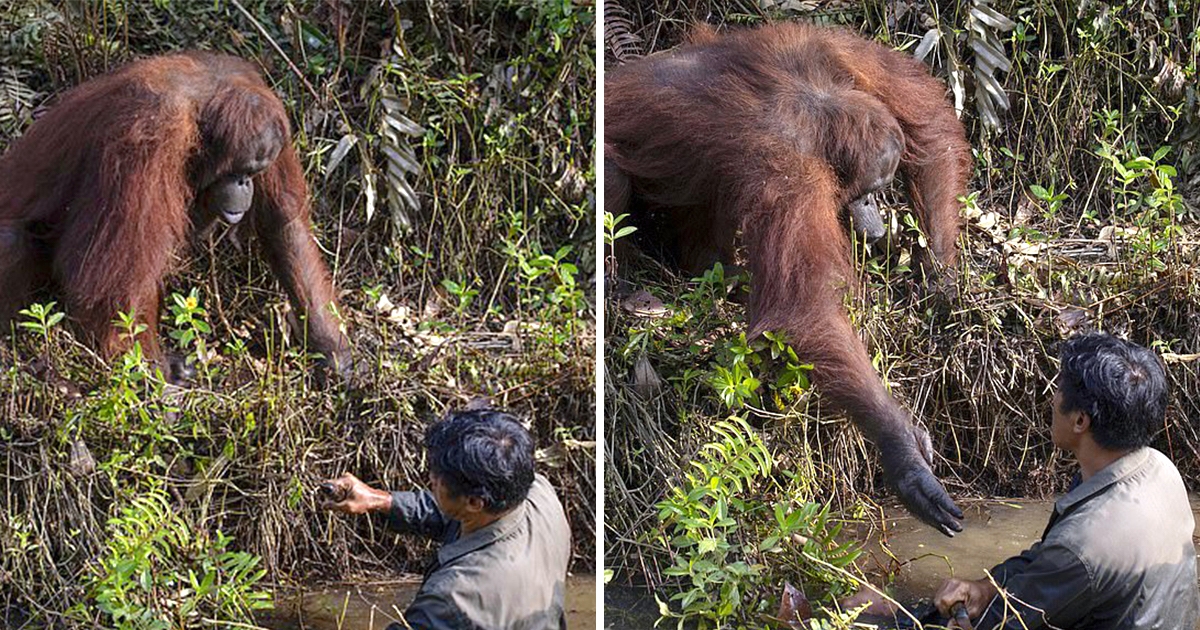 要幫忙嗎?紅毛猩猩見「人類在水裡」 竟主動伸手:我來拉你一把