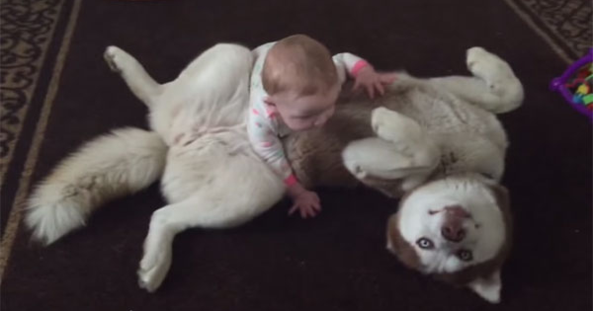 有了寶寶就要練習當保姆 哈士奇翻身仰躺:肚肚借你玩啦~