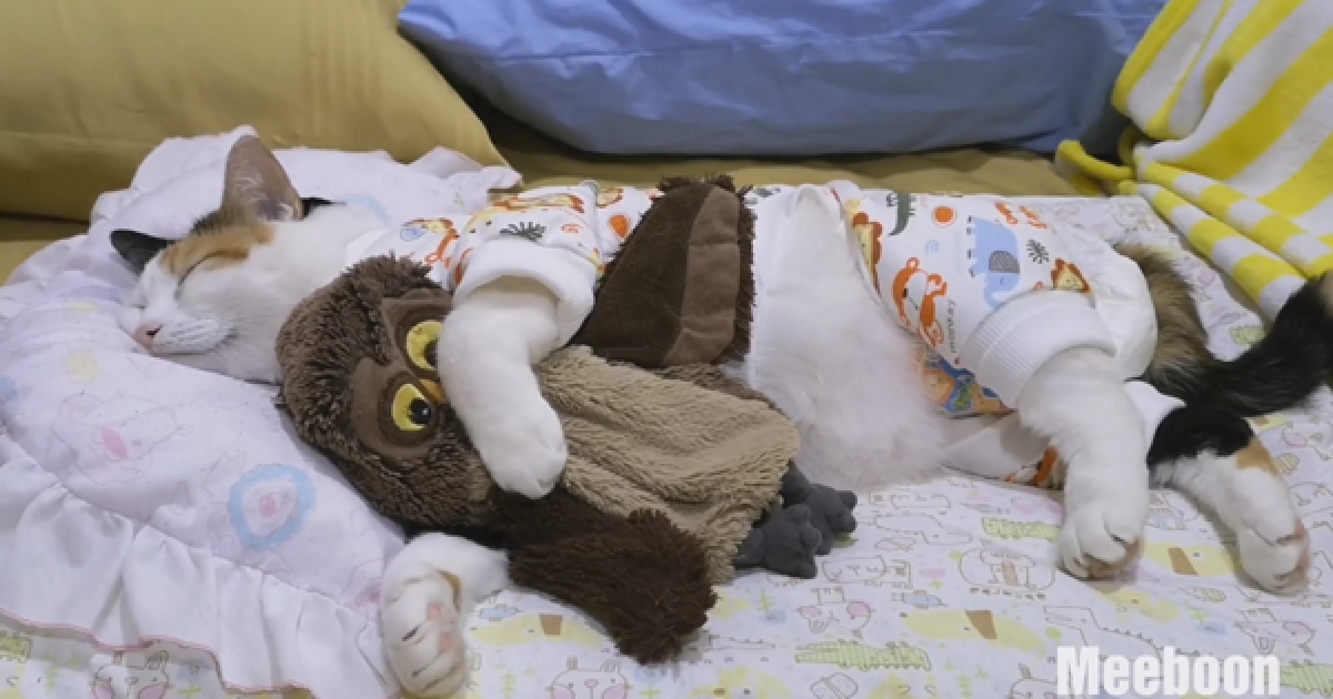 要抱娃娃蓋被被才能睡~ 萌喵等主人「晚安吻一啾」就甜甜進入夢鄉