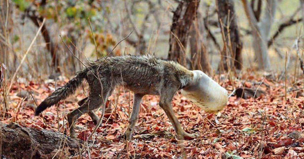 頭部卡住塑膠桶的狼已經快撐不下去 幸好遇到好心人「冒險也要救牠」