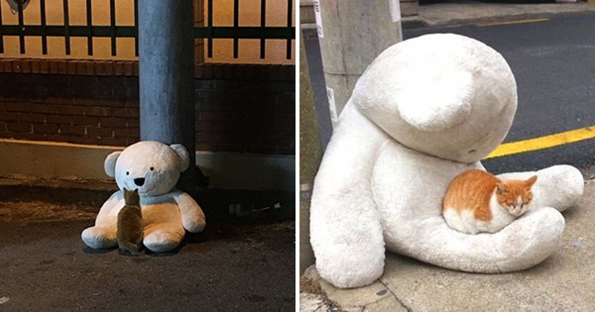 流浪貓和熊寶寶在路邊互相取暖的畫面逼哭大家,照片裡彷彿在說著「你跟我一樣被丟掉嗎」…