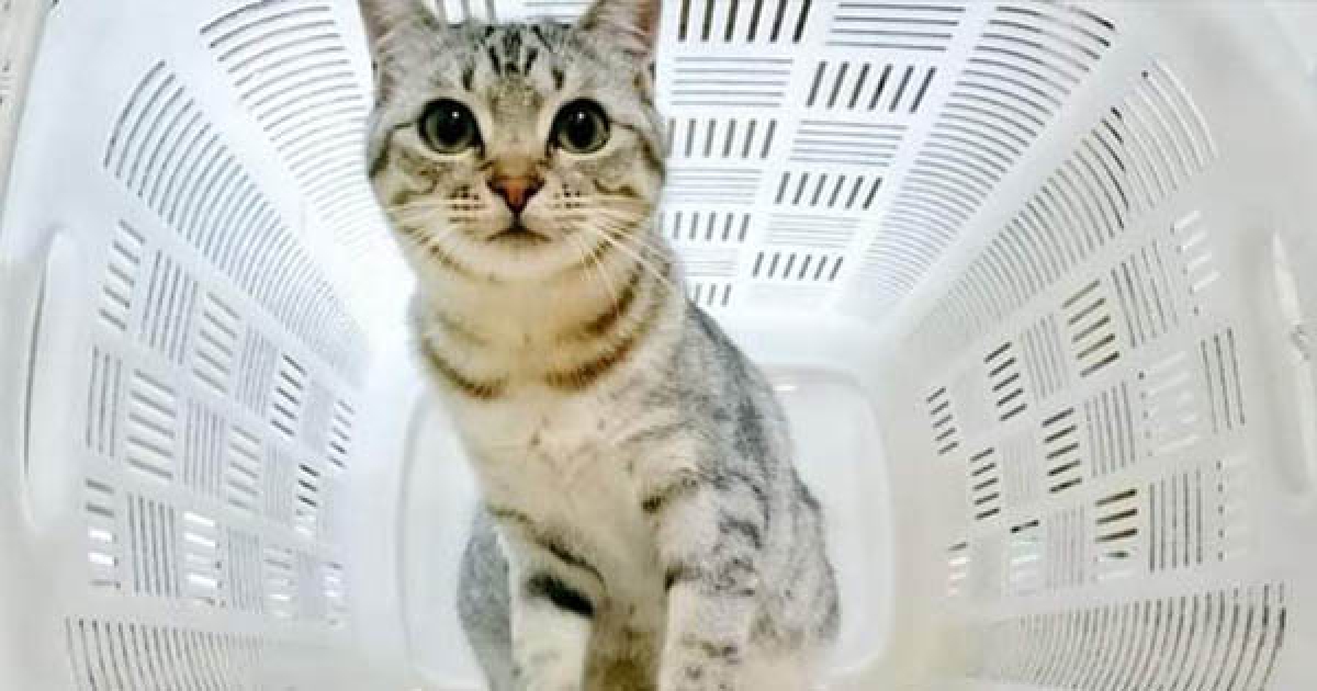 這隻貓咪只是亂玩就被主人拍下「超有未來感的照片」,道具其實就只是一個洗衣籃!