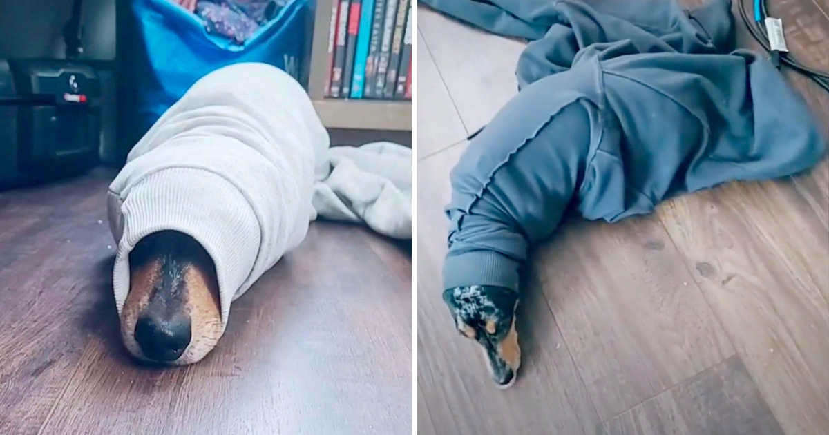 家裡怎多了一隻小海豹? 汪汪「看見袖子就想鑽」PP狂甩:媽快來救偶~