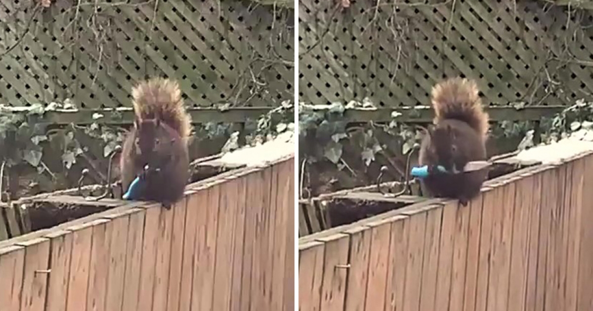 成精了? 胖胖松鼠「自帶玩具」跑後院玩耍 屋主仔細一看嚇呆:牠手裡拿著刀