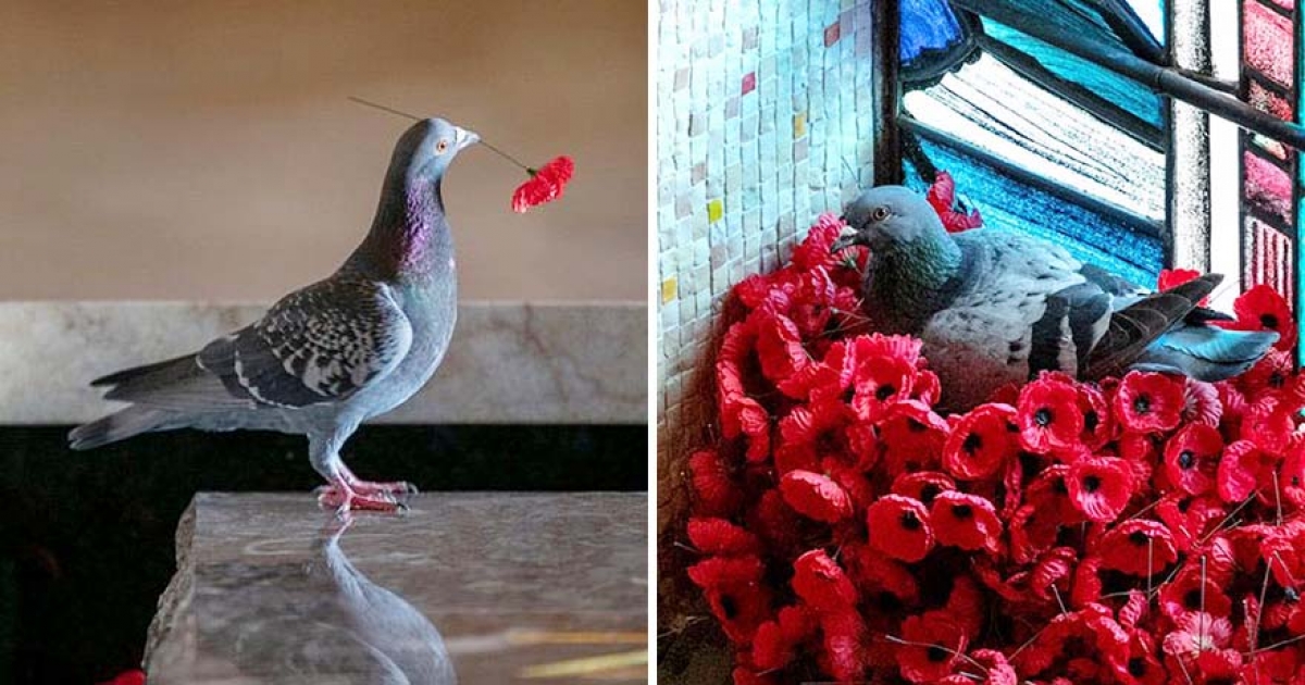 紀念碑上的花朵神秘消失 員工監視發現:原來是被鴿子叼去築華麗的家了