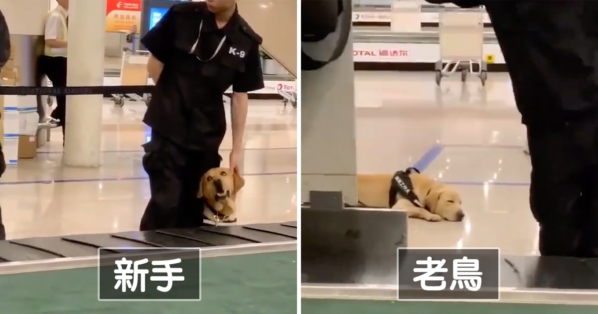 差那麼多!新手海關犬「上班緊張討摸摸」 一看「隔壁老鳥」老神在在:沒人來先度估一下~