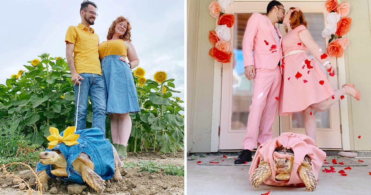 把寵物龜當孩子養~ 夫妻每天出門穿搭「一家三口」龜龜穿新衣萌呆❤
