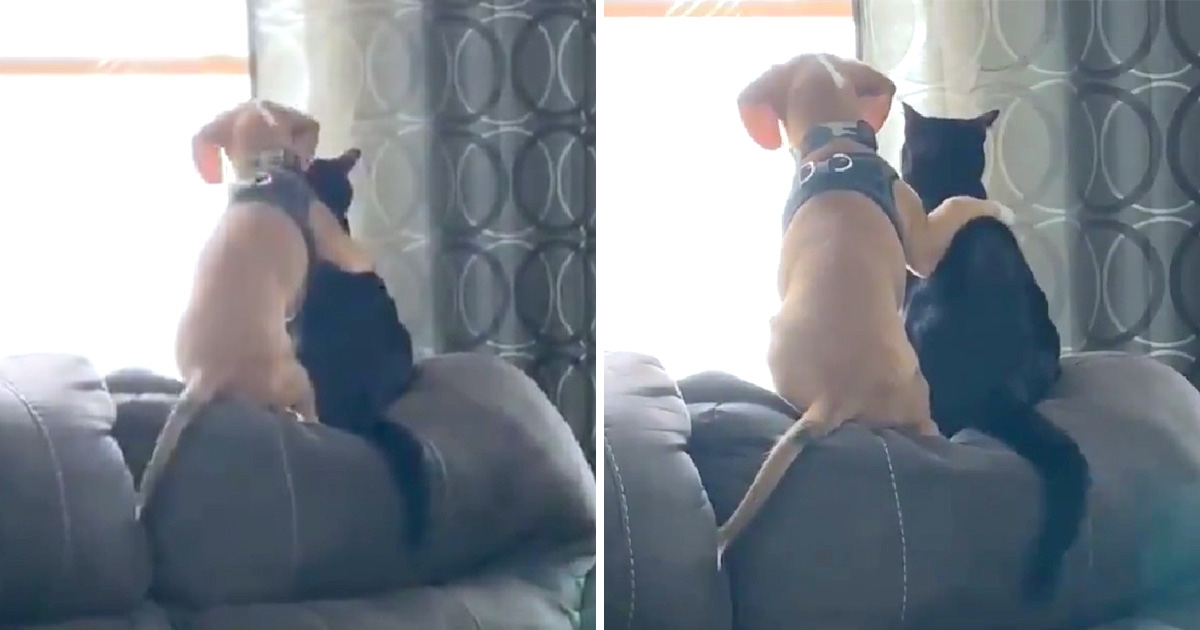在甜什麼啦~汪跳沙發「搭肩貓咪看風景」 主人無奈:我才是第三者