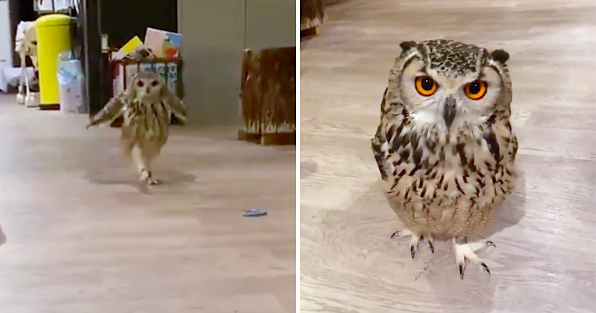 根本汪汪~ 「長腿貓頭鷹」一叫就跑來 中途「腳滑」還趕快裝沒事