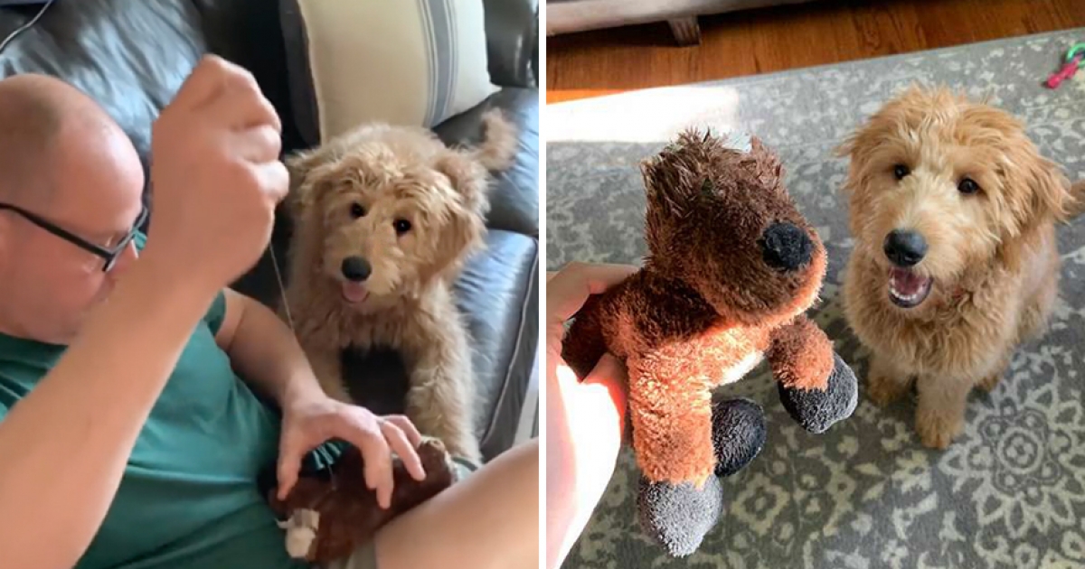 狗狗最愛的玩偶「突然裂開」超擔心 把拔一出手「救活它」讓狗狗笑了
