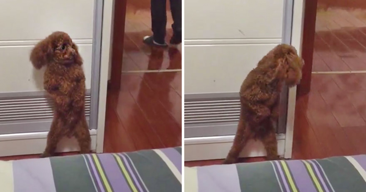 人家不想洗澡啦!紅貴賓上演「特務片」 馬步貼牆「探頭偷看」:人走了?