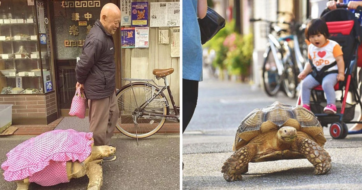 日本老爺爺街頭「遛龜」成奇景 帶70公斤老朋友散步引路人圍觀