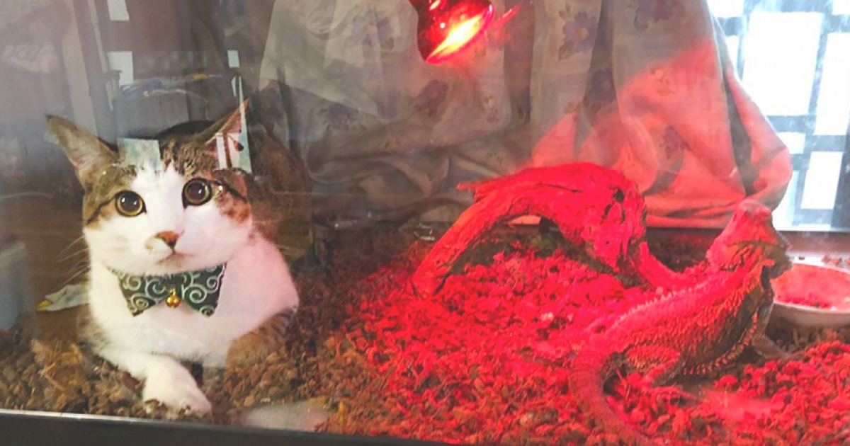 冷到翻進爬蟲箱取暖! 喵星人害鬃獅蜥嚇歪:你是什麼怪獸啦